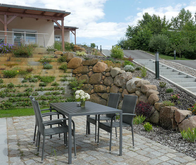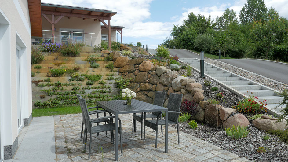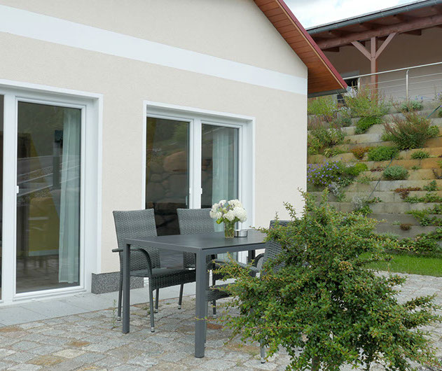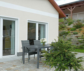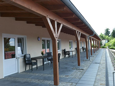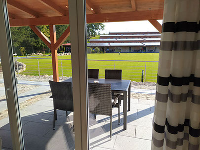 Jede Ferienwohnung hat eine eigene überdachte Terrasse mit Terrassenmöbeln.