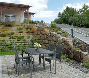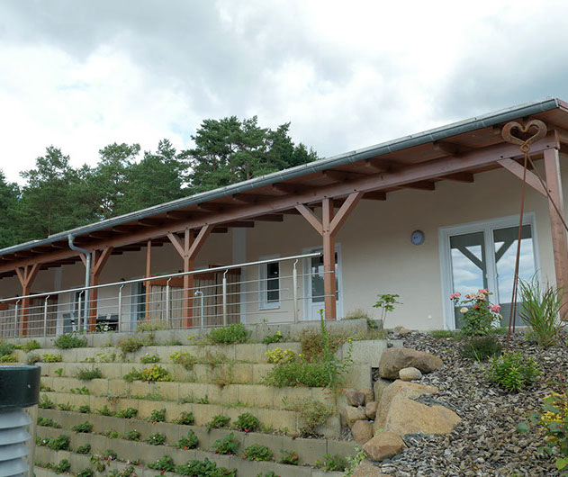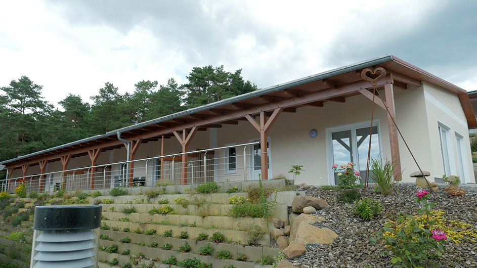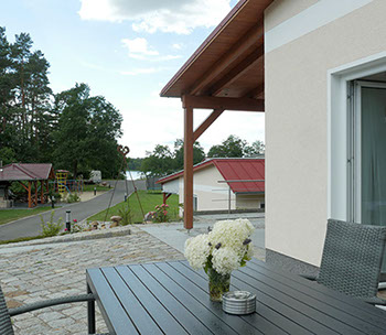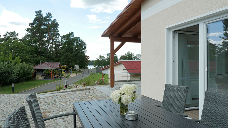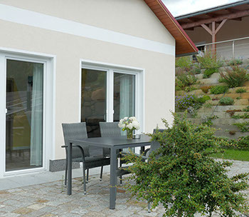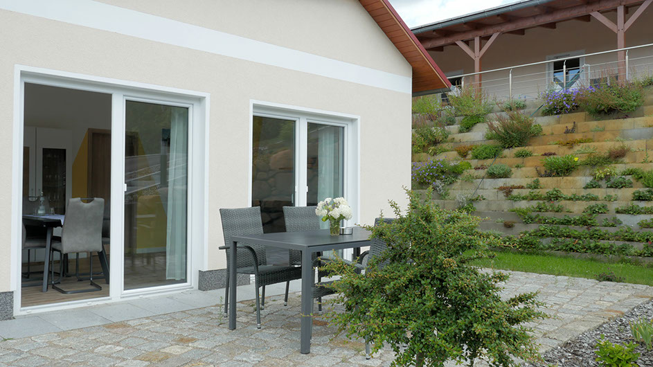 Jede Ferienwohnung hat eine eigene überdachte Terrasse mit Terrassenmöbeln.
